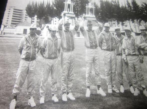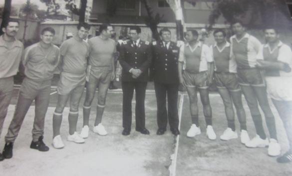 En las fiestas de Aniversario de la Policía Nacional, en el Comando Guayas, previo al juego, posan los integrantes de los equipos de la “Mecánica” y “Seguridad Pública”. Constan de pie de izquierda a derecha: Hugo Segura “Llavero”, servidor, Carlos Paredes, volador y Capitán Galo Acosta, colocador, este último, un jugador de notables condiciones, que con agilidad, destreza y potencia en el gancho; hizo prevalecer sus cualidades, cuando se enfrentó de igual a igual, con los mejores jugadores de volibol del país.