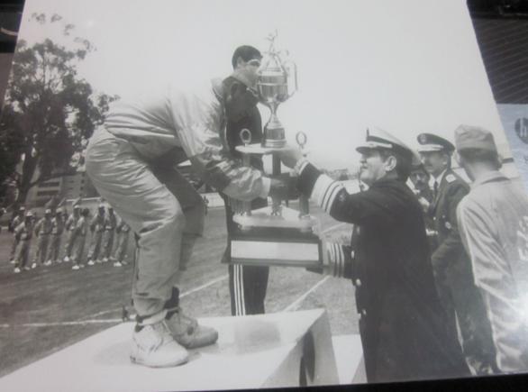 En la foto, los oficiales superiores, integrantes de los conjuntos de volibol de la Policía Nacional, con los trofeos obtenidos en los campeonatos organizados por las Fuerzas Armadas por su día clásico. Aparecen de izquierda a derecha los coroneles: Eduardo Carrera, Ernesto Avilés, Oswaldo Montalvo, Ramiro Proaño, Carlos Feijó, Luis